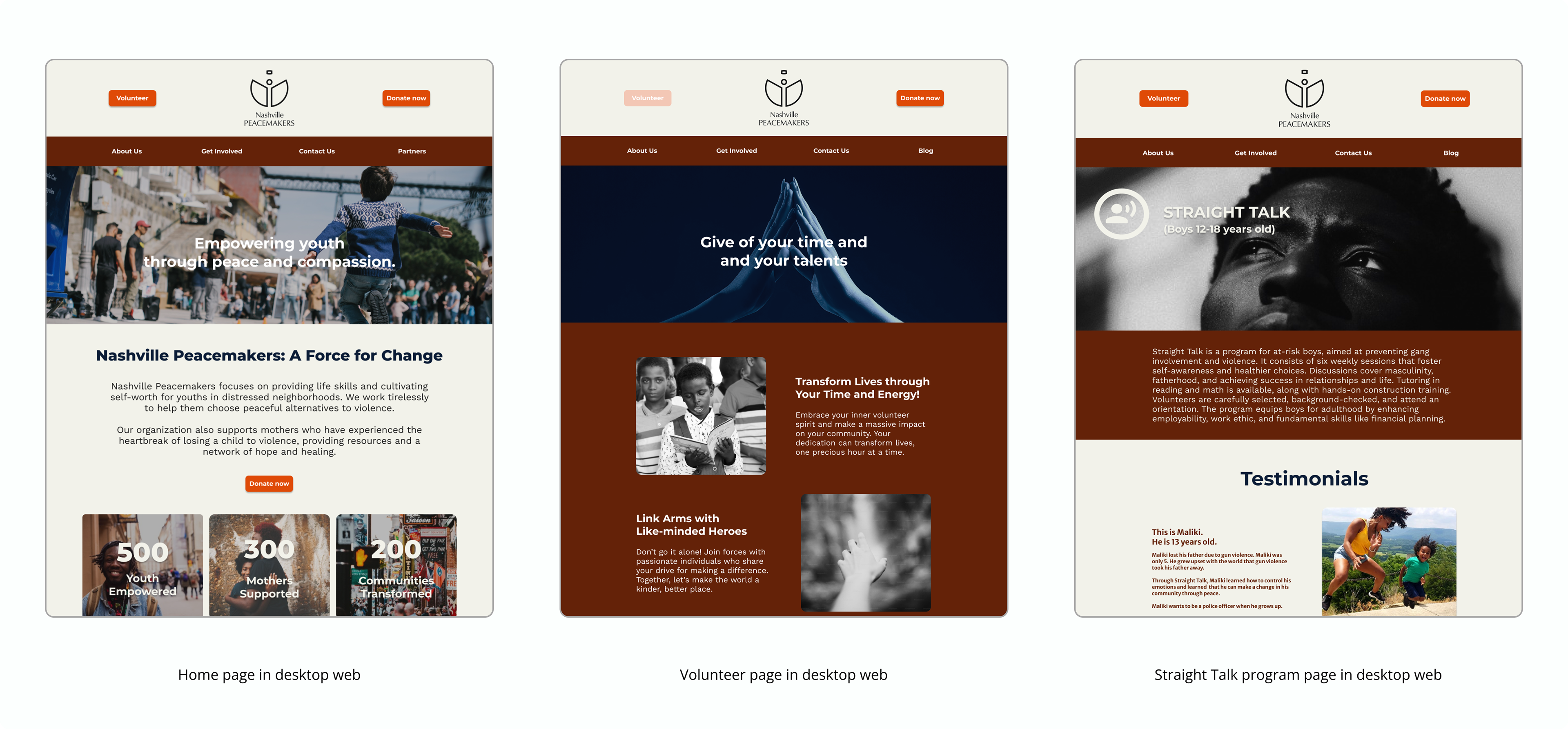 For the Nashville Peacemakers website redesign, we began by identifying key areas for improvement. Through interviews, we defined the organization’s brand identity—its mission, values, and target audience—to guide our design decisions and ensure the new site truly reflects the organization. We developed a cohesive design system, including color palette, typography, and visual elements, to maintain consistency throughout the site. Content was organized logically with a clear navigation structure that highlights the most important information. To develop the color scheme, I created a style tile inspired by the local Nashville scene, drawing from the fonts, colors, and styles of area signage and imagery.