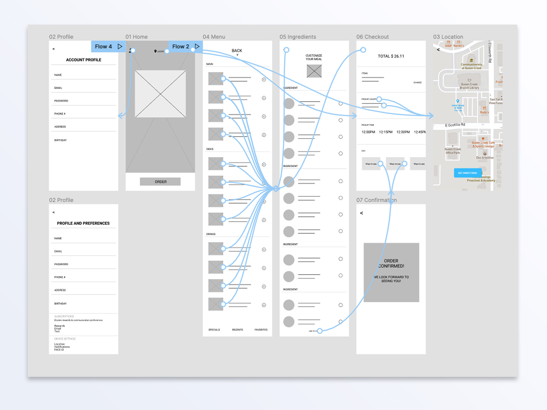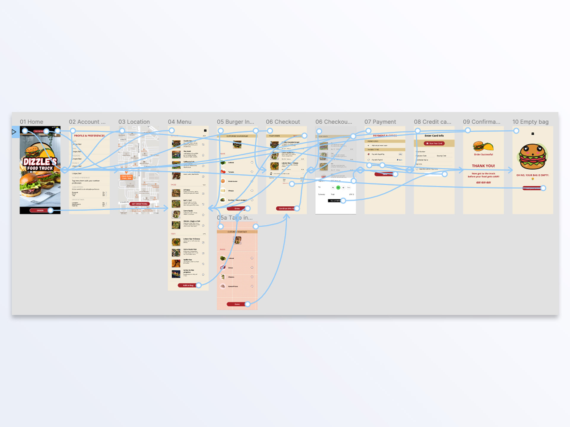 Using the finalized digital wireframes, I developed a low-fidelity prototype. The main user flow focused on building and ordering a meal from the Food Truck, allowing the prototype to be effectively used in a usability study.