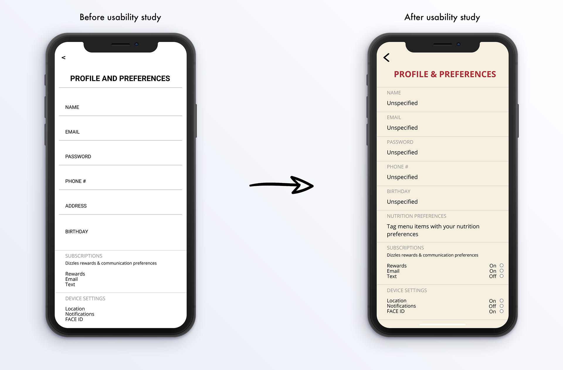 Early designs were geared toward the basic user profile. After the usability studies, I added additional options to the profile page to give users more control over app preferences.